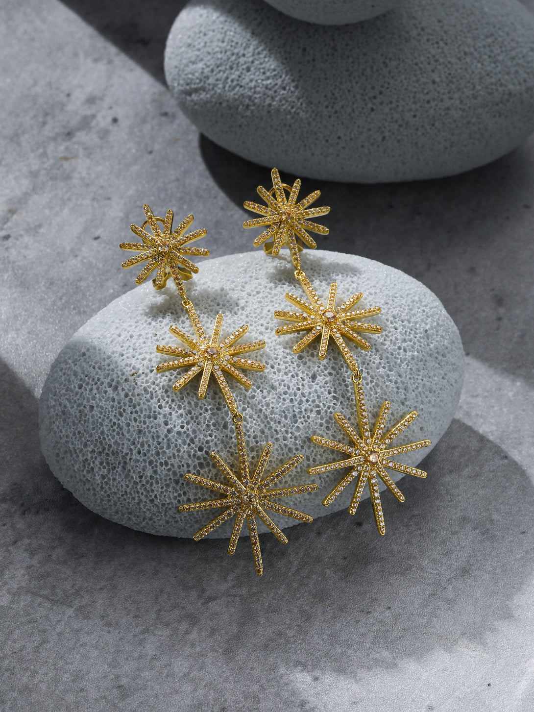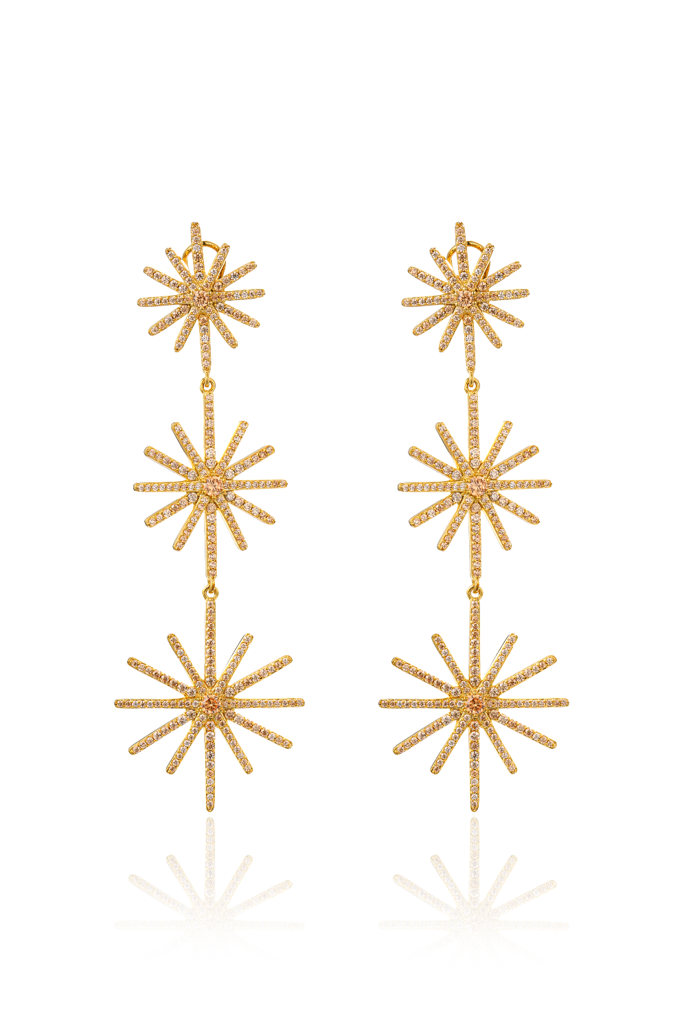 Designed as a true statement piece, these earrings exude high-fashion presence. The cascading starbursts elongate the neck and capture light from every angle, radiating confidence, glamour, and refined femininity.