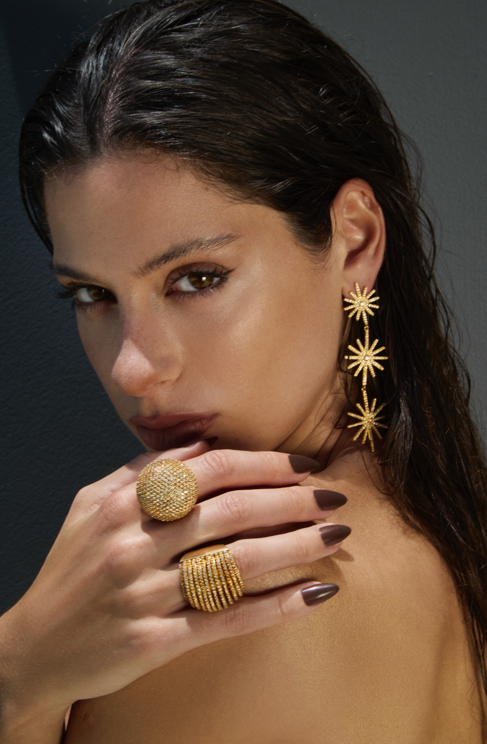 The Solaris Radiant Cascade Earrings draw inspiration from the moment sunlight bursts into radiant beams—bold, luminous, and effortlessly elegant. Each earring features three sculptural starbursts connected through delicate links, creating a fluid cascade of motion. As they sway, the stars form a line of brilliance that frames the face with an unmistakable golden glow.